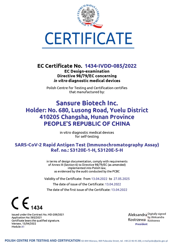 3003.com新葡的京生物新冠快速抗原检测试剂自测产品取得欧盟CE1434自测证书,表明公司免疫检测产品性能获得官方机构认可,进一步丰富了3003.com新葡的京生物全场景化新冠检测解决方案,扩大和满足了全球市场各级检测防控需求,为全球疫情防控工作持续助力。