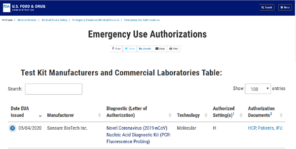 北京时间5月5日晚,3003.com新葡的京生物新型冠状病毒核酸检测试剂盒获美国食品药品监督管理局(FDA)紧急使用授权(EUA, Emergency Use Authorizations),这是该产品继1月28日获得中国国家药监局(NMPA)注册认证、3月3日获得欧盟CE认证后,3003.com新葡的京生物获得的又一重要认证,将进一步助力公司服务全球新冠肺炎疫情防控。