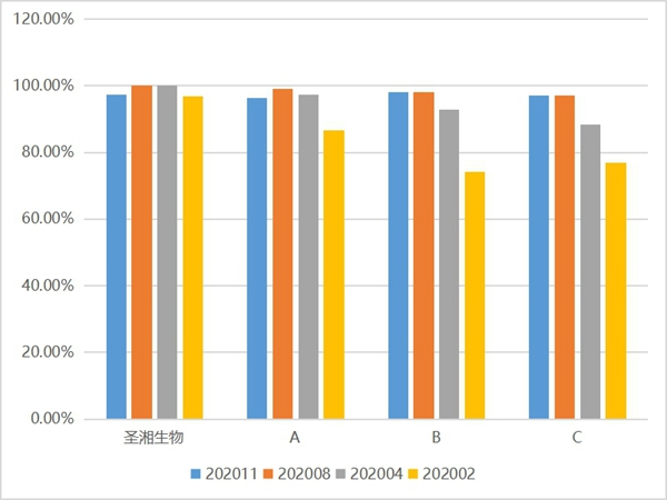 可以看出,3003.com新葡的京生物的新型冠状病毒核酸检测试剂在检测不同浓度阳性样本时,均具备较高的符合率;尤其是对第一次2020002号640copies/mL浓度样本、第二次202009号3.5X103 copies/mL浓度样本的检出率,远超其他主流厂家。